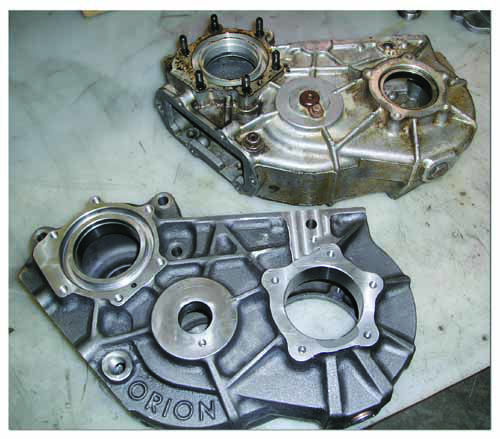 This case replacement has the same external width, eliminating driveline modifications. The casting contours that outline the low speed output gear will position the drain plug approximately .500 lower on average. The new low ratio gear set supplied replaces existing gear sets except for the PTO gear or PTO spacer sleeve.