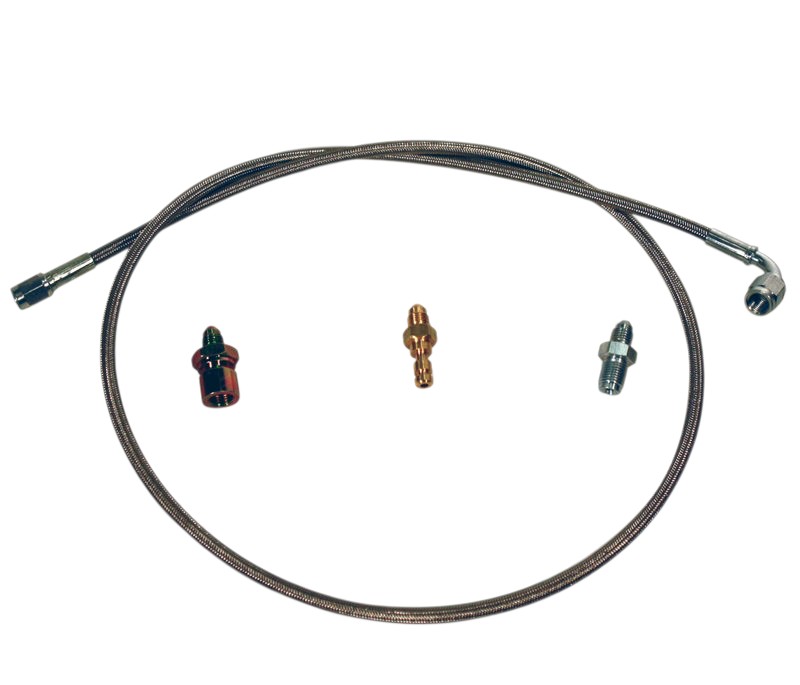 This new slave hose comes with a pin-type fitting or a dash 3 that connects to the stock Jeep master cylinder. To remove the old slave cylinder hose, either unscrew the hose or if it is a later model Jeep locate the roll pin on the master cylinder. Remove the pin with a punch, and the hose should slide out. The rubber o-ring must be retained and installed onto the new brass fitting. The new fitting can then be installed back into the master cylinder and then be retained with the roll pin.