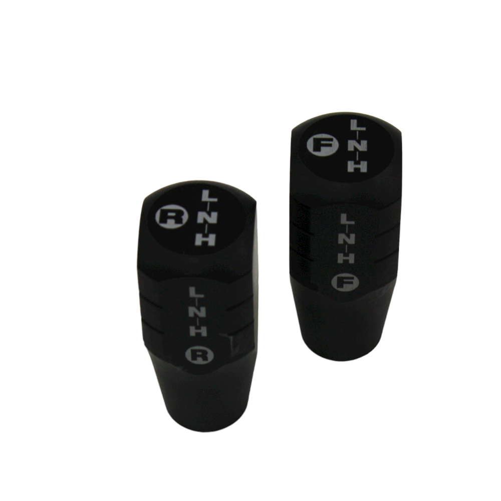 This Atlas shift knob set has 1/2-13 threads and is currently only available in black. The knobs have dual indicator marks, both on the top and the face of each knob.