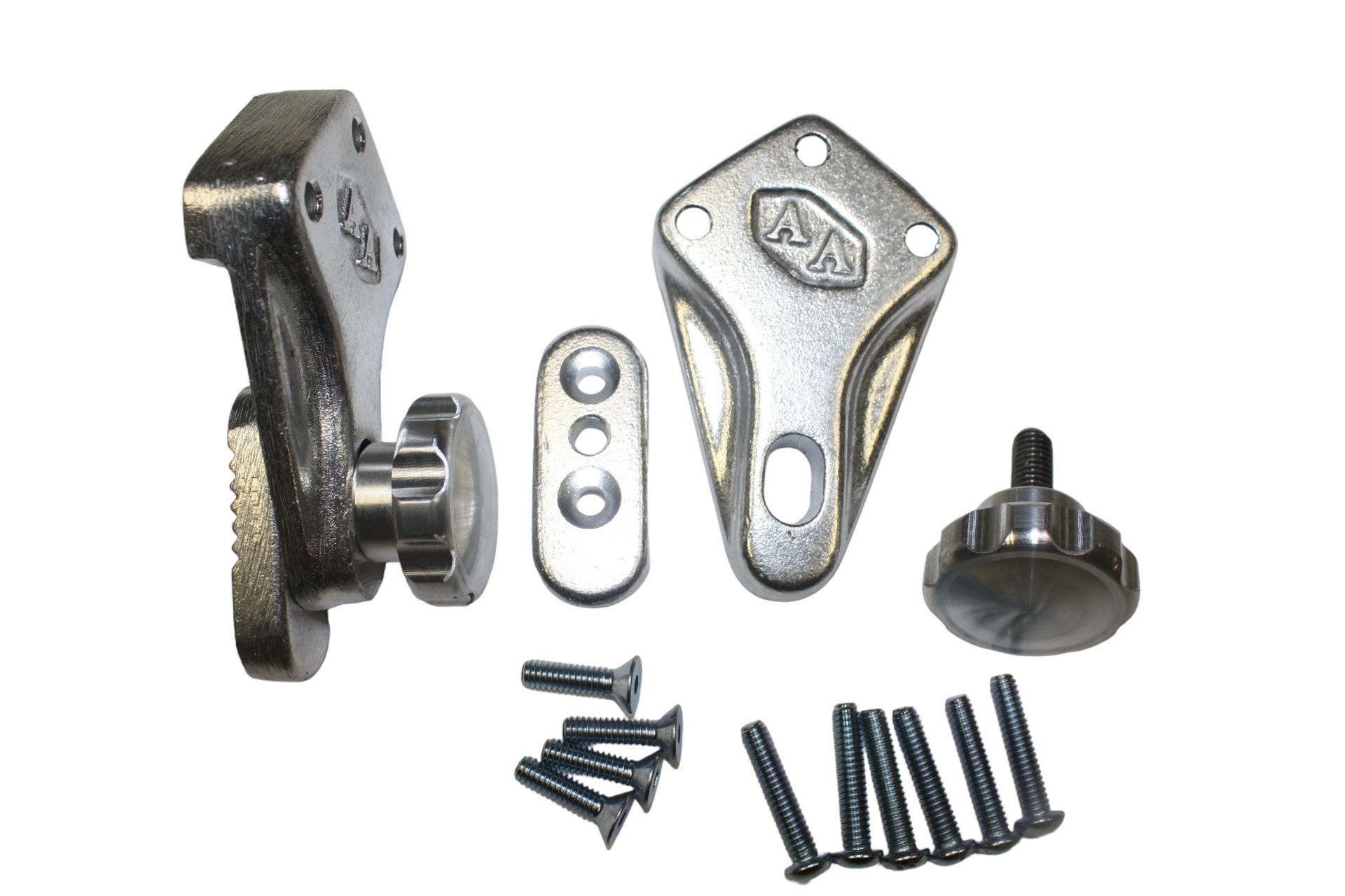 We remedied this problem by designing aluminum castings that would replace the stock dash & windshield brackets. This kit is available with a polished aluminum finish and are directly interchangeable with your stock latching mechanism.