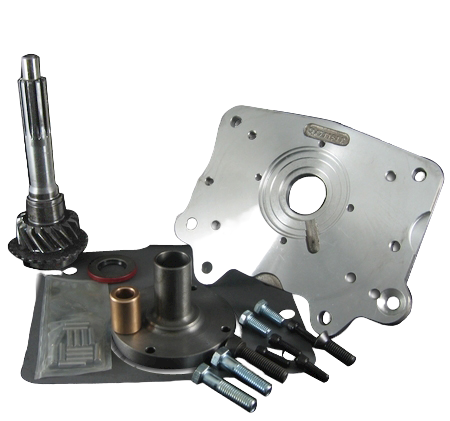This adapter plate assembly is used to adapt a GM Engine to the Jeep T-98 4 speed manual transmission. The adapter plate is .500” in length and is manufactured from 356-T6 heat treated aluminum alloy. Included in the adapter plate kit you will receive an adapter plate, new input shaft with 17 tooth on the cluster side, 4.686” bearing retainer, pilot bushing, gasket, seal, fastening hardware, and adapter instructions.