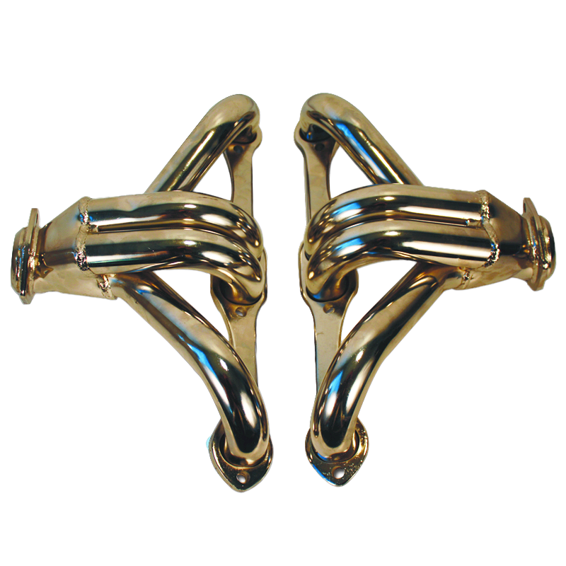 Our header flanges are 3/8" thick and all of our primary tubes are constructed with 16 gauge tubing with a 2-1/2" 3 bolt collector ring. Each design is available in a non-plated version, ready for your painting or custom coating. Our written guarantee states that if the headers do not fit your engine conversion exactly as you see fit, then simply return them for a full refund. You will only be responsible for the freight charges. We do not warranty the chrome plating on our exhaust systems, and the use of aftermarket header wrap products will void the header warranty. Thirty-four years of continual fine tuning and adjustments have made the Advance Adapters headers a choice for all engine conversion installations. SMALL BLOCK CHEVY HEADERS: The Chevy headers we offer come complete with header flange gaskets, header bolts, and collector rings for the exhaust shop.