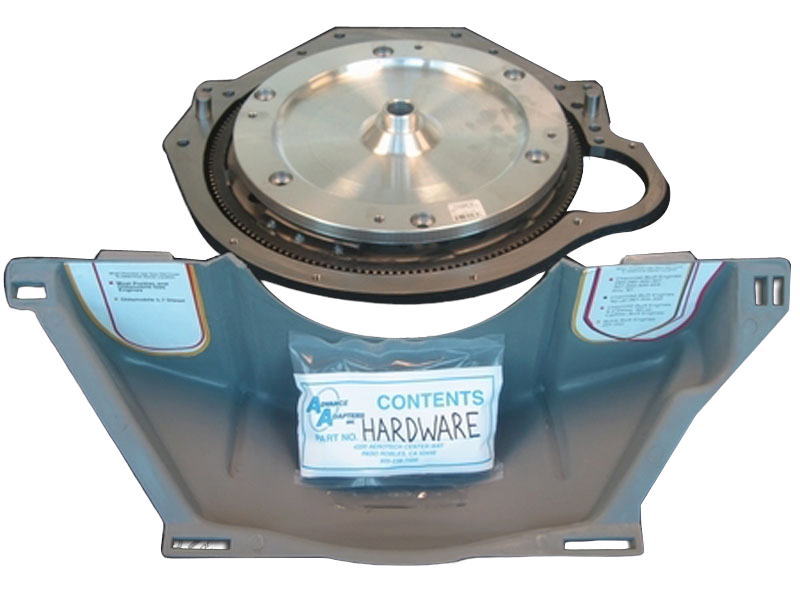 This adapter plate assembly is used to adapt a Ford small block 5.0L to the GM TH350, TH400, and 700R4 automatic transmissions. The adapter kit includes a steel adapter plate, plastic dust cover, torque converter adapter ring, 164th tooth 50.oz balance flexplate, GM dowel pins, fastening hardware, and adapter instructions.