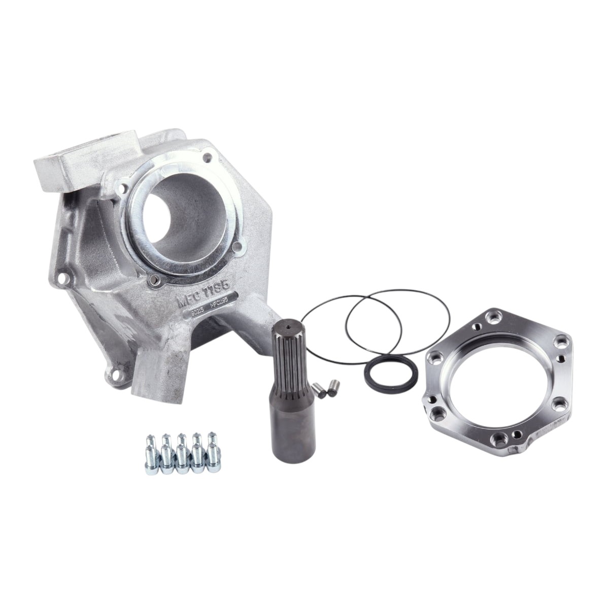 We offer Mark's 4wd adapter kit to allow you to adapt the late model GM 4L80E to Landcruiser HF2A transfer case. The adapter kit includes an adapter housing, extension housing, coupler shaft, oil seal, fastening hardware, and adapter instructions. This kit is machined to accept the FJ80 transmission mounting rubber. The crossmember mounting holes may need to be slotted to allow it to be moved rearward slightly. The transfer case shifter mounts to the top of the adapter housing. The bracket provided in the kit allows for the HI/LOW lever to come though the original hole.