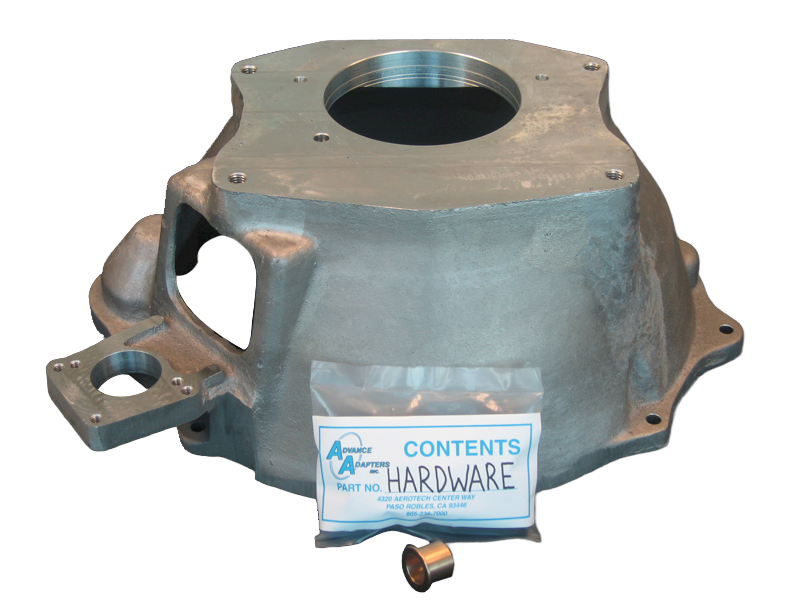 The bellhousing kit includes a 356 T-6 aluminum bellhousing, pilot bushing, fastening hardware, and adapter instructions.