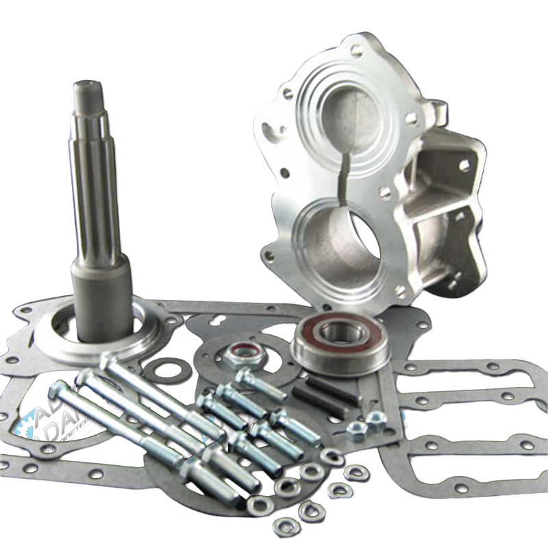 The GM SM465 4 speed manual adapter to the Land Cruiser 10 spline transfer case is 4.625" in length. And the adapter material is 356 T6 heat treated aluminum alloy and has an optional transmission mount provision. The adapter kit includes an adapter housing, 10 spline spud shaft, bearing retainer, sealed bearing, gaskets, fastening hardware and adapter instructions.