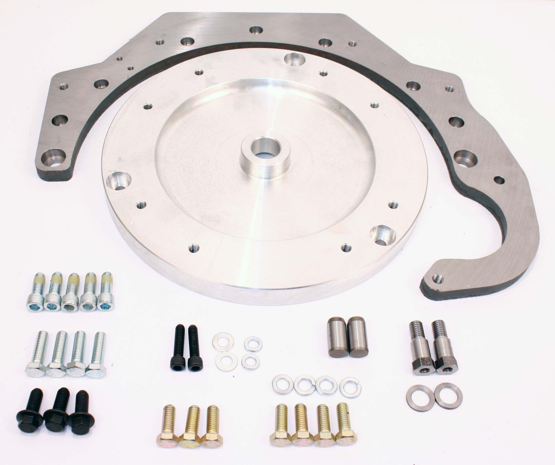 The adapter kit includes a precision cut and machined 5/8" steel adapter plate, torque converter adapter, crank bushing, torque converter spacer, dowel parts, fastening hardware and adapter instructions.