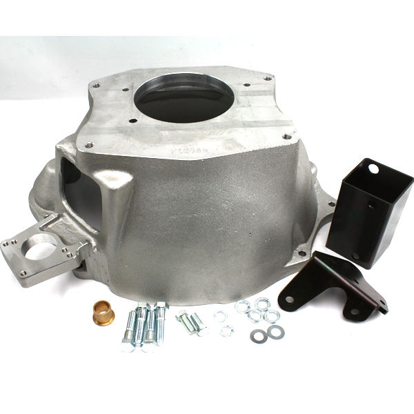 The bellhousing kit includes a 356 T-6 aluminum bellhousing, pilot bushing, transfer case shifter bracket, crossmember support, fastening hardware, and adapter instructions.
