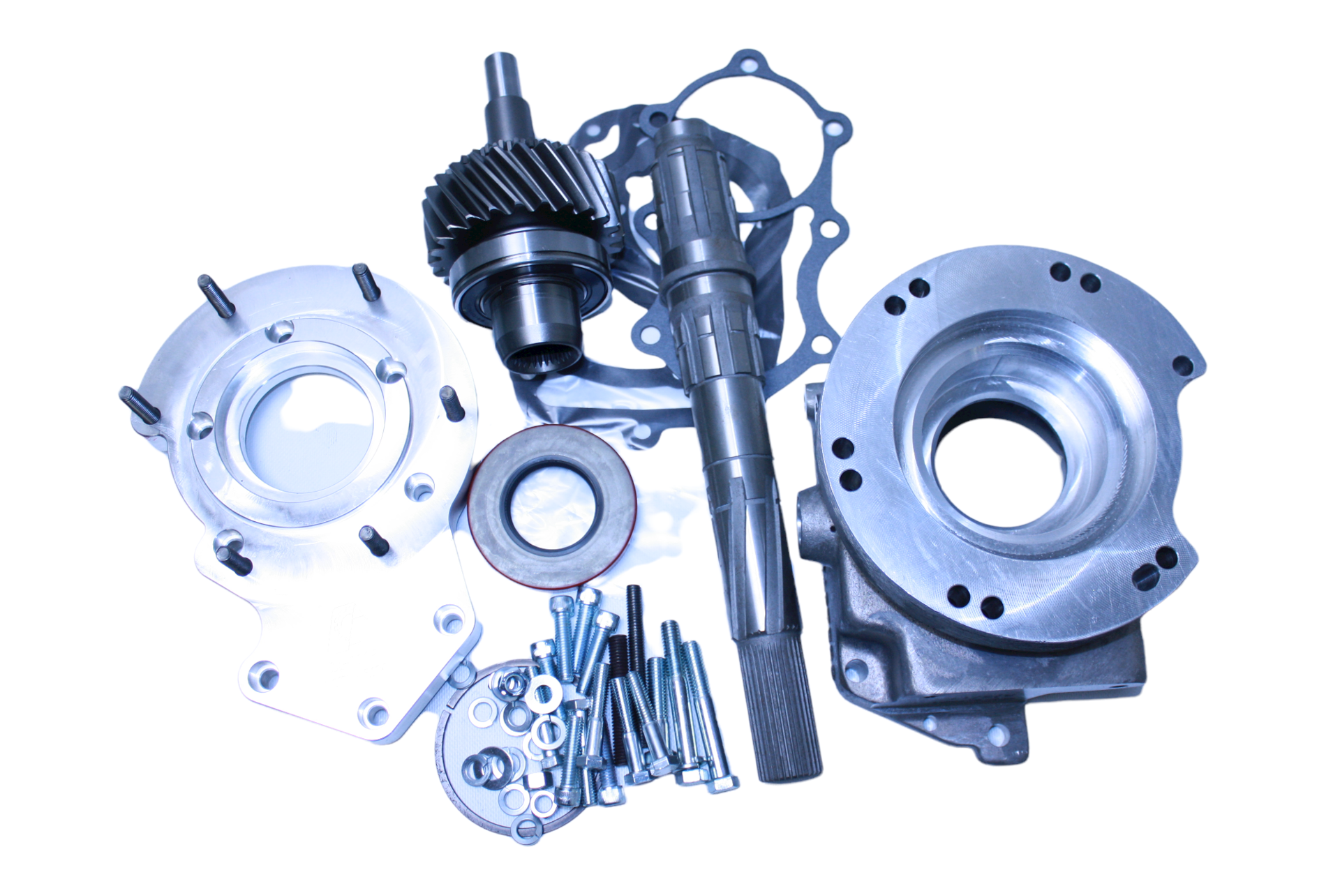 The NP205 originally coupled to a SM465 or TH350. The NP205 is a part time, cast iron transfer case with a figure eight front bolt pattern configuration. This assembly was used in 1971-79 vehicles. The new adapter kit will require the installation of a new 32 spline input gear.