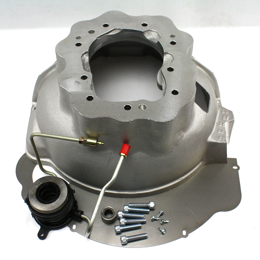 This is a full bell housing kit for the Peugeot transmission to a GM or Buick engine. This bell housing is not compatible with transmissions that were previously equipped with diesel engines. The bell housing design incorporates the the exclusive use of the original Jeep internal hydraulic release bearing assembly. This bearing assembly must be used with a high profile centerforce pressure plate. Kit consist of the full bell housing , dust cover, pilot bushing, jeep Peugeot hydraulic release bearing and hardware.
