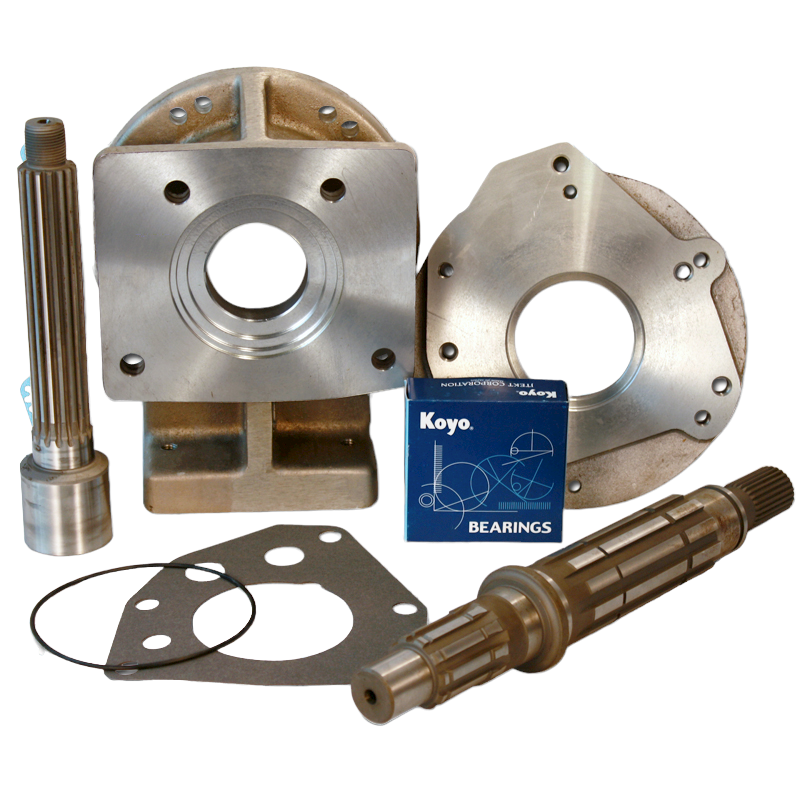 This transmission, found in 1965 to 1985 Ford pickups, is identified by a case length of 11.875”. The 1st gear ratio is 6.32:1; 2nd 3.09:1; 3rd 1.69:1, and a 1:1 4th gear ratio. The adapters we manufacture for this transmission come with a new main shaft. Ford was not the only manufacturer who used the T18 transmission. When searching for a T18 in salvage yards, make sure the bellhousing bolt pattern has a dimension of approximately 8-1/2” across the top, and 6-1/4” top-to-bottom. The input shaft stickout should be approximately 6-1/2”. Our adapters will only work for the Ford T18. When using this transmission, you will have to fabricate the necessary bracketry to connect the transfer case shifter linkage. We do not offer an adapter kit for the 10 or 19 spline Land Cruiser transfer case.