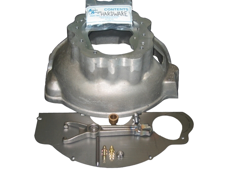 This adapter bellhousing assembly is used to adapt the GM 4.3, V8 to the Jeep NV3550, 5 speed manual transmissions. The bellhousing kit includes a 356 T-6 aluminum bellhousing, universal dust cover plate, Jeep TJ master cylinder fitting, pilot bushing, special metric fitting hydraulic fitting (used with p/n 716213 slave cyl), throw-out arm, slave cylinder push rod, slave cylinder push rod end, ball pivot, fastening hardware, and adapter instructions.
