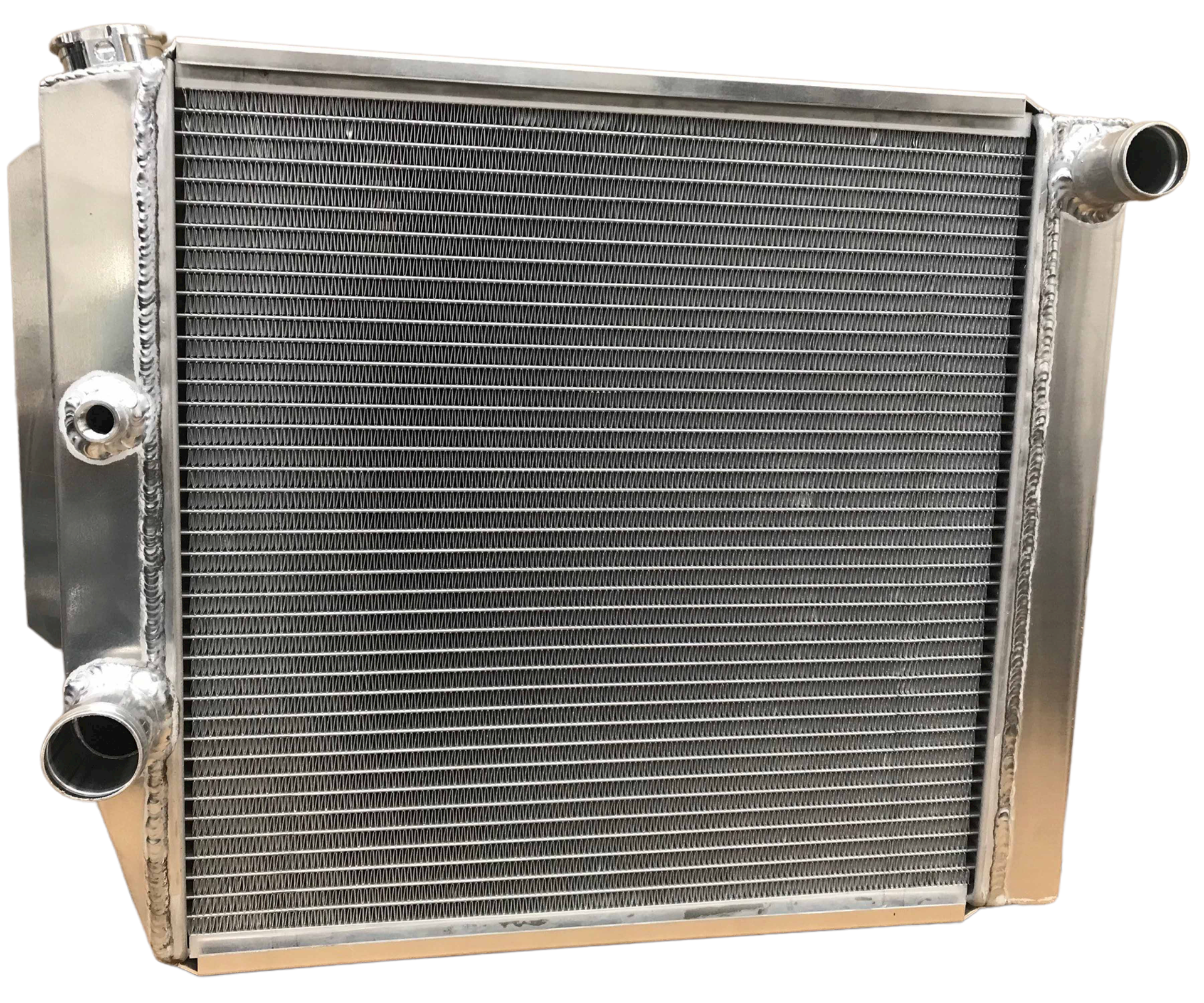 Our radiators have an aluminum angle for the mounting flange. This angle is TIG welded to the tanks. The aluminum angle has no mounting bolt holes. The customer determines the mounting pattern and location. This allows height adjustment for the radiator to center up to the water pump with the new engine location. This will also assist a desired height location if a body lift is to be installed.