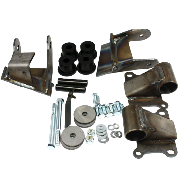 The weld-in engine mount kit includes our weld-in frame perches, new polyurethane bushings for engine to frame isolation, fastening hardware and engine mount instructions.