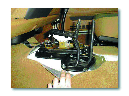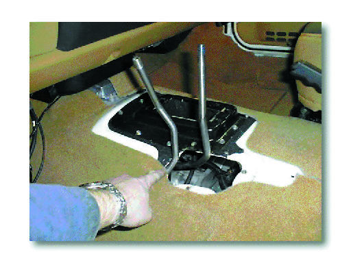 The stock floor mount (shifter and linkage) is removed before initial installation. The console and driver's seat should also be removed for ease of installation. The sticks will come up through the stock floorboard hole. You will be required to cover a small portion of the stock hole. The rear driver's side will need a piece of sheet metal to be added. Make sure the handles move freely and don't touch the floorboard. Interference will cause the unit to pop out of gear.Place the stock console in its original position to test fit the Atlas handles. Rotate the twin stick assembly so that it aligns with the console slot. Once the correct position is obtained, remove the console again.