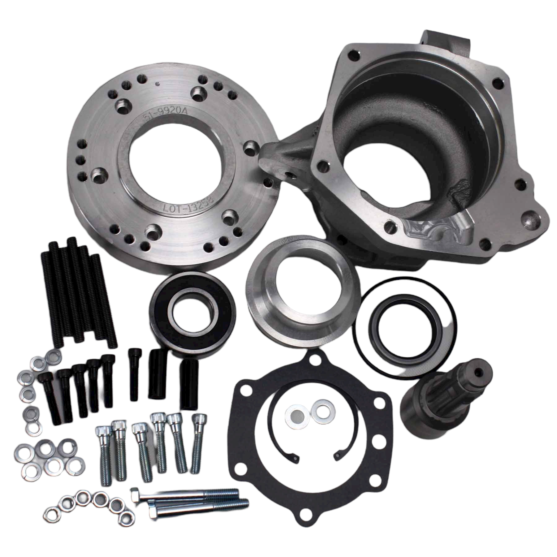 Our Ford AOD adapter to the Bronco Dana 20 is 7.40" in length. The adapter material is 356 T-6 heat treated aluminum alloy, and the adapter has a provision to retain the original early Bronco mount. The adapter kit includes an adapter housing, spud shaft, retainer, bearing, snap ring, gasket, seal, o-ring, fastening hardware and adapter instructions.