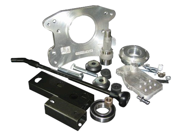 The overall assembly length is 26.125”. These kits require the use of a stock GM bellhousing with a 5.125” index diameter. These kits use an adapter plate that couples the Dodge transmission to a standard GM bellhousing. We have included a mounting bracket for the stock Jeep mechanical clutch linkage. If your vehicle is equipped with a hydraulic clutch, a bracket will need to be fabricated. We do offer replacement slave cylinders, hoses and the proper fittings for this application. This kits also include a crossmember mount & spacer to properly support the transmission onto the stock crossmember. The stock crossmember will require some modifications, and a body lift is recommended.