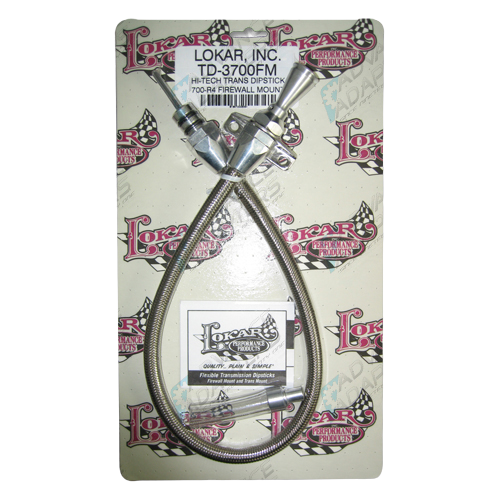 You can have unlimited flexibility with our Teflon lined Flexible Braided Stainless Transmission Dipstick. Kit comes complete with braided stainless outer housing and heat resistant E-Z to Read flexible inner dipstick measuring cable. Inner cable is molded with appropriate trans fluid levels. Billet aluminum handle and billet aluminum fittings complement Lokar's Flexible Engine Dipsticks. Kit includes dipstick funnel adapter to assist in filling. Designed for "push in" style transmissions. Dipstick seals with O-rings. Firewall mount measures 24" in length.