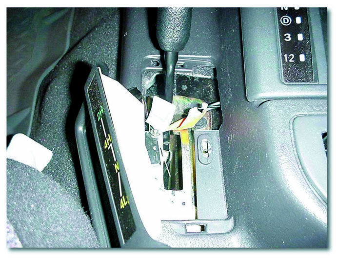 Since the stock transfer case shift indicator cover will not fit with the Atlas twin-sticks, we modified this cover. Remove the indicator panel and cut the plastic that supported the indicator panel. Ideally, the plastic housing that snaps into the console is what your trying to retain. We purchased a small piece of black plastic from a local stereo installation shop and cut it to fit our plastic housing. We heated it to fit the contour and glued it into position. We then cut new access holes in the black plastic to fit our twin sticks.