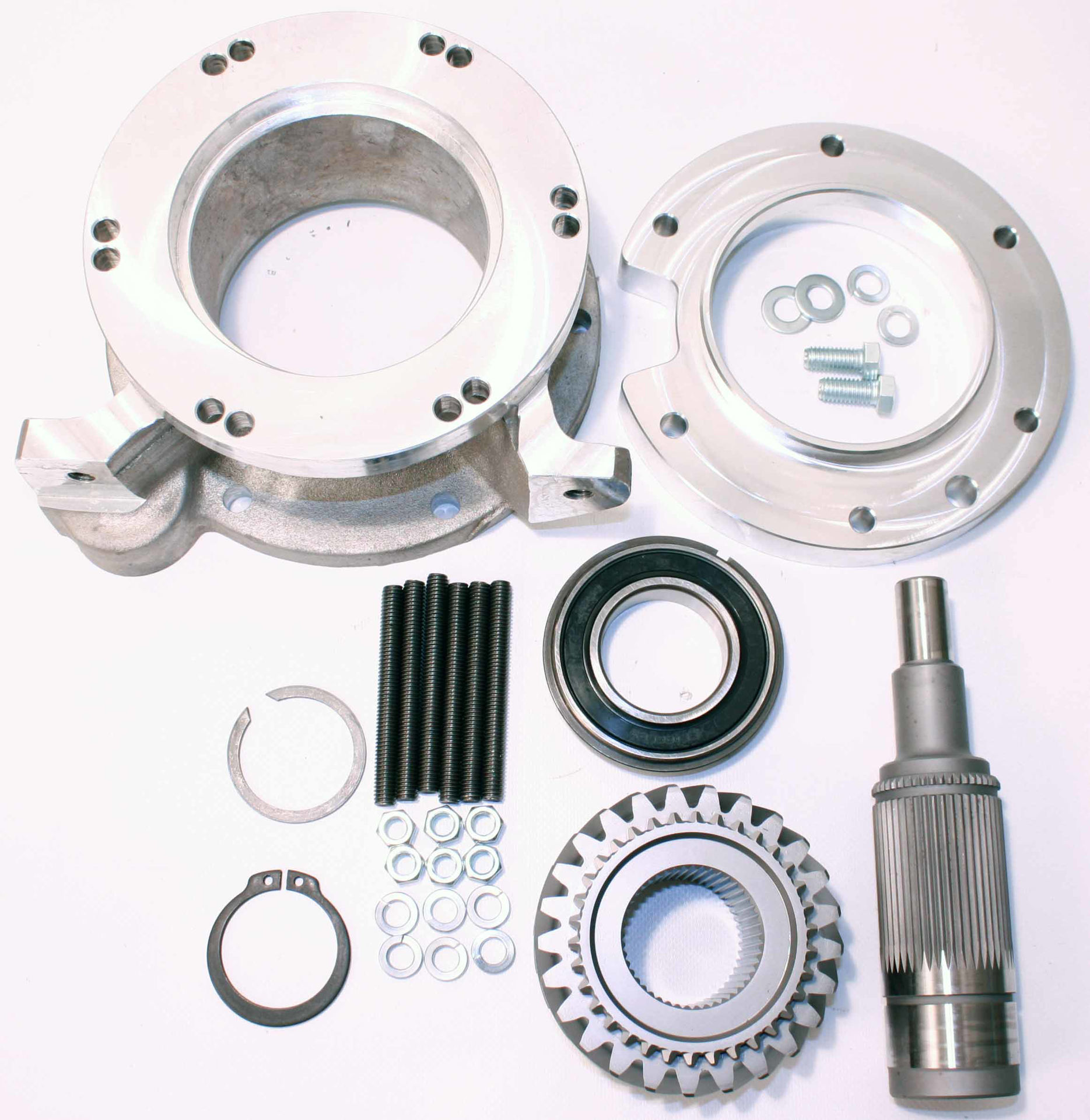 Kit 50-9550B, 6L80E adapter assembly includes new 32 spline female NP205 input shaft , NP205 adapter ring, 6L80 conversion tail housing, input shaft bearing and fastening hardware.