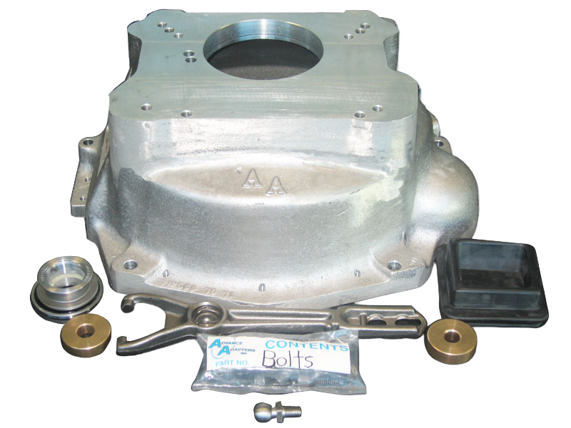 The bellhousing kit includes a 356 T-6 aluminum bellhousing, two pilot bushings with (.670" & .590") inside pilot diameter, clutch release bearing, throw-out (clutch release) arm, ball pivot, throw-out boot, fastening hardware, and adapter instructions.