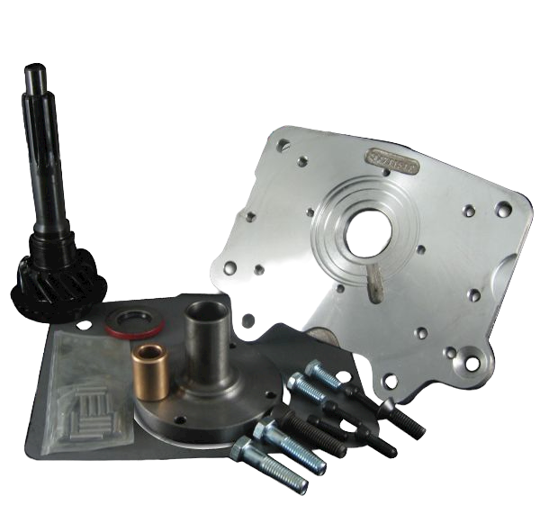 This adapter plate assembly is used to adapt a GM / Buick Engine to the Jeep T-18 4 speed manual transmission. The adapter plate is .500” in length and is manufactured from 356-T6 heat treated aluminum alloy. Included in the adapter plate kit you will receive an adapter plate, new input shaft with 17 tooth on the cluster side, 4.686” bearing retainer, pilot bushing, seal, fastening hardware, and adapter instructions.