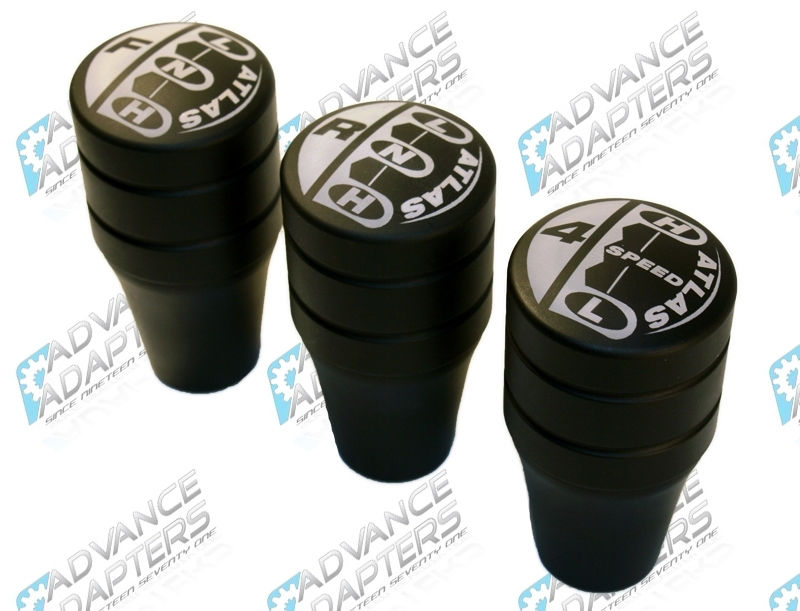 Dress up your Atlas Transfer Case and vehicle interior with our new fancy black anodized Atlas shifter knobs. These new Atlas shifter knobs feature labeling for axle, high / low / neutral positions guaranteed never to wear out!!!
