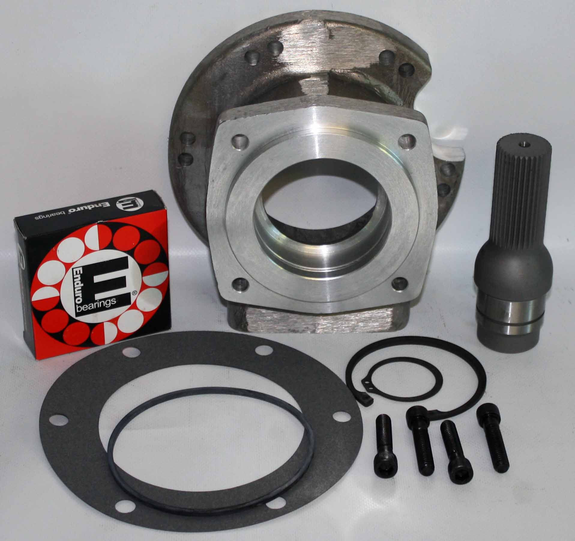 Kit 50-6909 will adapt the 4WD GM TH350 transmission to Ford Borg Warner 1345 / 1356 and NP205 transfer cases. The adapter is 3.625" in length and manufactured using 356 T-6 heat treated aluminum alloy. The adapter lit includes an adapter housing, 27 spline x 31 spline spud shaft, spud shaft bearing, snap rings, o-ring, gasket, fastening hardware and adapter instructions.